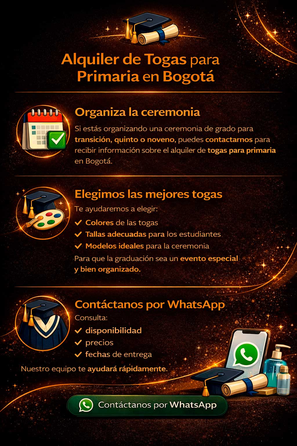 Las ceremonias de graduación en primaria representan un momento muy especial para los estudiantes y sus familias. Nuestro servicio de togas para primaria en Bogotá ofrece alquiler de togas y birretes para ceremonias de grado de transición, quinto y noveno, con diferentes colores y tallas para cada estudiante.
